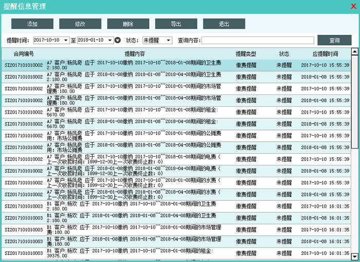 | 提醒管理:默认显示未来3天的提醒预警信息。支持导出提醒信息内容。 |