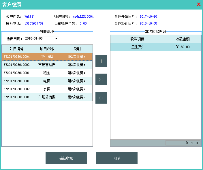 | 客户缴费界面默认在左侧列出更近应该缴费的费用清单,可以通过修改缴费日期来切换要缴费的清单内容。点击中间部分的"+"按钮可以添加额外的收款项目。将要收款的项目明细添加到右侧的表格后,点击确认收款,即可进行收款结算操作。 |