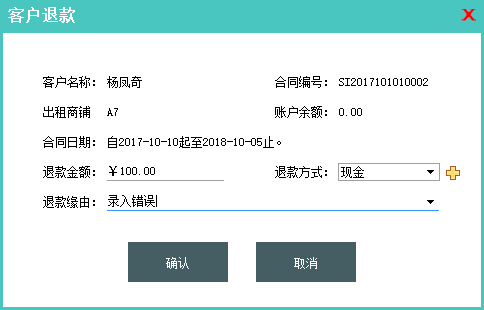 | 在退款界面录入退款信息和退款缘由后点击确认即可完成退款。退款记录会在收支明细和客户账务中显示体现。 |