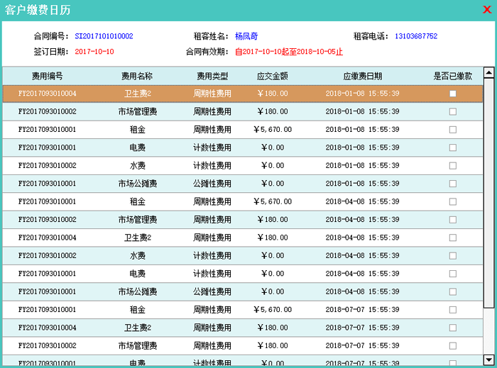 | 缴费日历:该功能有两个入口(1.主界面右键菜单中选择"缴费日历",由该入口打开的查看页面,只显示客户未付款的费用信息;2.签约管理模块中,其他操作-->查看缴费情况,由该入口打开的查看页面会显示客户已付款和未付款的所有费用项目)。该功能主要用于查询已出租客房的缴费情况。 |