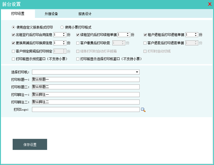 | 2.1.1、前台设置:包含打印设置、外界设备设置和报表设计功能。支持二代身份证阅读器和来电通设备。 |