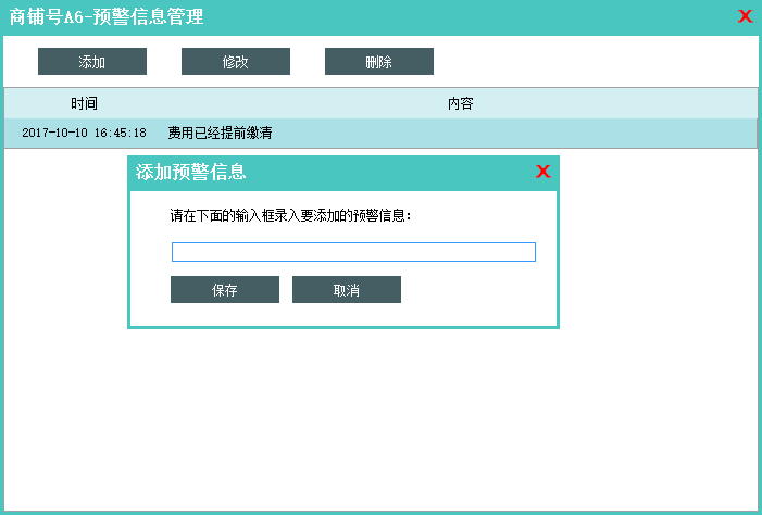 | 预警信息: 该功能用于向已出租的客房添加一些备注信息。有预警信息的房间,房态图的右下角会显示一个"警"字标示。 |