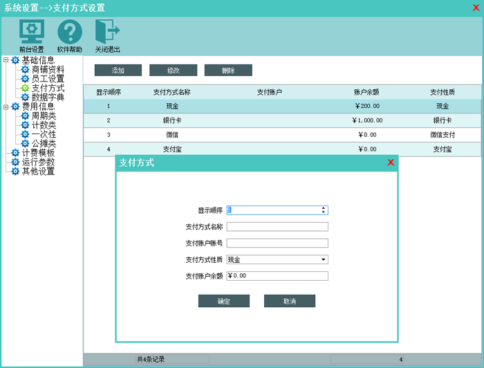 | 3、支付方式:管理软件中用于收款是记录的收款方式。支持自定义支付方式,支持微信、支付宝支付(需要开通美萍E+支付功能,并且需要设置支付方式的支付性质为微信或者支付宝) |