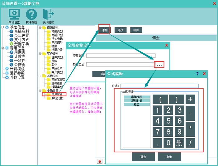 | 关于全局变量设置的特别说明:全局变量分用户变量和系统变量。系统变量由软件内置,不允许添加修改或者删除。用户变量可以由客户自定义设置。变量的计算基础是系统变量,可以通过设置不同的计算公式来实现用户变量的定义。 |