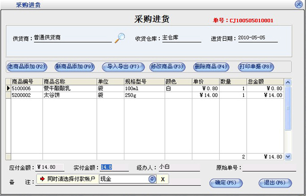 采购退货的操作步骤与采购进货一样,可以参见采购进货操作。