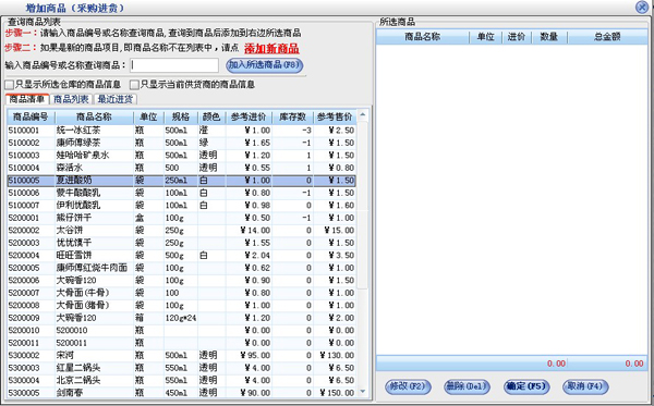 在“增加商品”窗口中分为两部分,左边的是商品信息,右边是已选商品。在“商品编号或名称”后的文本框中可以输入商品编号、商品名称、名称简码、单位、规格型号就可以查询到相应的商品信息,商品信息可以分为三类如图,商品清单是所有的商品,商品列表是所有的类别,每个类别又对就相应的商品,更近进货是更近时间进的前20种商品。选中相应的商品点击“添加”按钮,在出现的窗口中输入参考进价和数量就可以把该商品增加到所选商品中。所选商品中的“修改”“删除”按钮是对所选商品进行修改和删除操作的。点击“保存”按钮把所选商品中的商品保存到采购进货窗口中。再点击采购进货如图14的“保存”按钮来保存。