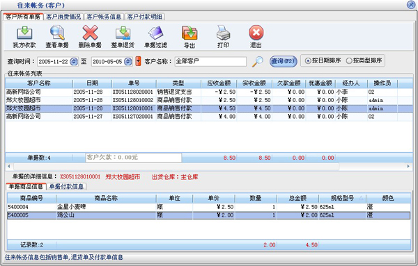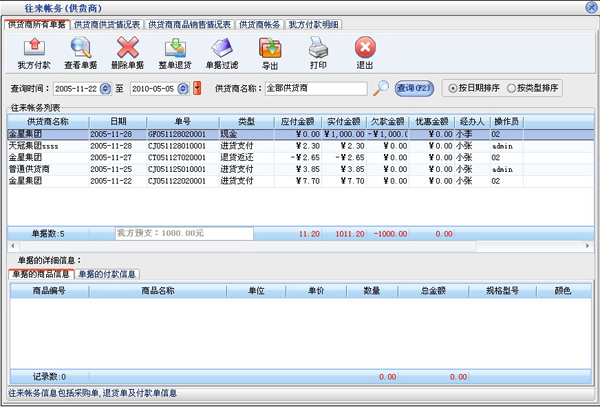 在往来帐务窗口中共分为三部分:供货商所有单据、供货商商品业务情况、供货商帐务。
