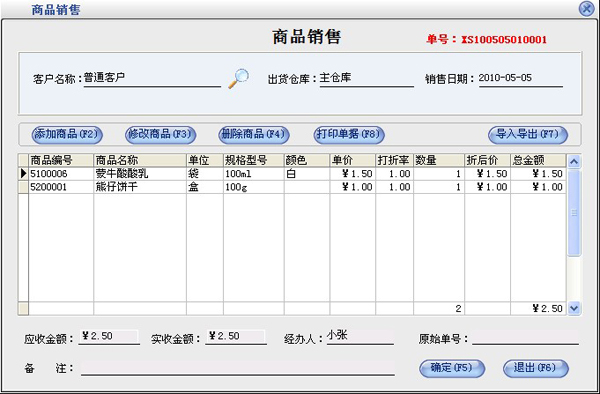 在商品信息这一部分输入新增商品的所有信息,点击“保存”按钮即可把该商品保存到右边的已存商品中,保存后可以继续输入下一种商品。在“已存商品”中可以点击鼠标右键对选中的商品进行删除或删除全部已存的商品。如果商品增加完后可以直接点“退出”按钮。退出增加商品窗口后会在商品列表中看刚才增加的商品。如果要修改商品,先选中要修改的商品,点击“修改”按钮打开商品修改界面,在商品修改界面中修改相应的信息点击“保存”即可。点击“删除”按钮即可以把选中的商品删除,该商品发生过业务则是不能删除的。