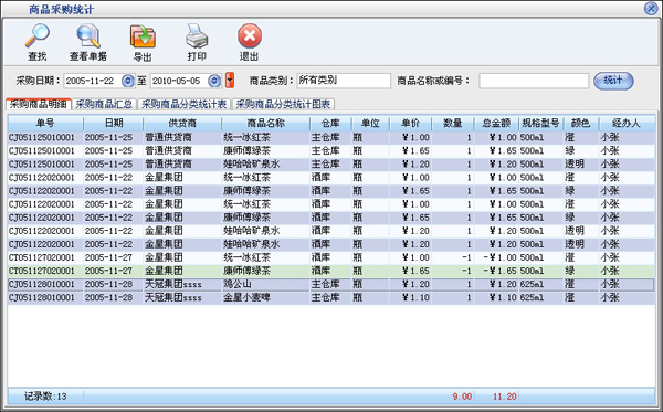 - 供货商商品业务情况显示某个供货商提供的商品的业务情况,在列表中可以看到供货商的商品业务的数量,金额和库存量。