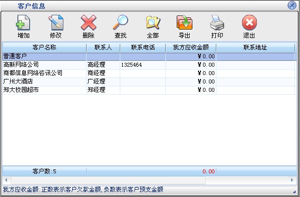 在基本设置模块中点击“客户信息”按钮打开客户信息窗口如图6。在窗口中可以看到所有的客户。点击“增加”按钮打开增加客户窗口,输入客户的信息,客户名称不能重复。如果该客户有期初金额则在“期初应收”后输入相应金额。如果选择中“默认客户”在商品业务和顾客退货打开窗口的时候显示的为该客户,默认客户只能有一个。点击“修改”按钮可以修改选中的客户信息。如果该客户有业务发生则不能修改期初应收金额。点击“删除”按钮可以删除选中的客户,如果该客户有业务发生则不能删除。系统有一个“普通客户”是不能被删除的。点击“查找”按钮打开客户查询窗口,输入相应的条件查询不同的客户信息。点击“全部”按钮可以列出所有的客户信息。 |