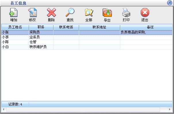 在基本设置模块中点击“员工信息”按钮打开员工信息窗口如图7。在窗口中可以看到所有的员工。点击“增加”按钮打开增加员工窗口,输入员工的信息,员工名称不能重复。点击“修改”按钮可以修改选中的员工信息。点击“删除”按钮可以删除选中的员工,如果该员工有业务发生则不能删除。点击“查找”按钮打开员工查询窗口,输入相应的条件查询不同的员工信息。点击“全部”按钮可以列出所有的员工信息。 |