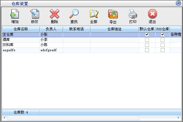 在基本设置模块中点击“仓库设置”按钮打开仓库设置窗口如图8。在窗口中可以看到所有的仓库。点击“增加”按钮打开增加仓库窗口,输入仓库的信息,仓库名称不能重复。如果选择中“默认仓库”在所有单据打开窗口的时候显示的为该仓库,默认仓库只能有一个。点击“修改”按钮可以修改选中的仓库信息。点击“删除”按钮可以删除选中的仓库,如果该仓库有业务发生则不能删除。点击“查找”按钮打开仓库查询窗口,输入相应的条件查询不同的仓库信息。点击“全部”按钮可以列出所有的仓库信息。