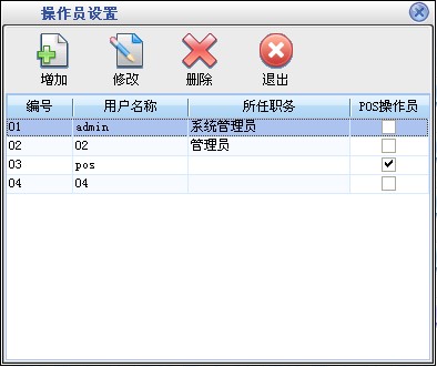 在基本设置模块中点击“操作员设置”按钮打开操作员设置窗口如图9。在窗口中可以看到所有的操作员(包括前台的收银员)。点击“增加”按钮打开增加操作员窗口,输入操作员的信息,操作员编号、操作员名称不能重复。点击“修改”按钮可以修改选中的操作员信息。点击“删除”按钮可以删除选中的操作员。“admin”操作员为超级管理员,有所有的权限,该管理员不能被修改和删除。系统中设定后台的操作员不能操作前台,前台的收银员也不能操作后台。