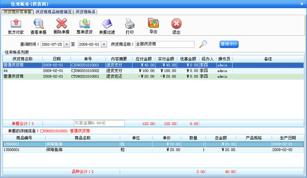 进货管理:进行商品采购入库,采购退货,进/退单据和当前库存查询,与供货商的往来帐务。