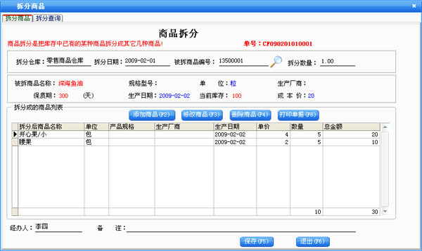 在商品信息这一部分输入新增商品的所有信息,点击“保存”按钮即可把该商品保存到右边的已存商品中,保存后可以继续输入下一种商品。在“已存商品”中可以点击鼠标右键对选中的商品进行删除或删除全部已存的商品。如果商品增加完后可以直接点“退出”按钮。退出增加商品窗口后会在商品列表中看刚才增加的商品。如果要修改商品,先选中要修改的商品,点击“修改”按钮打开商品修改界面,在商品修改界面中修改相应的信息点击“保存”即可。点击“删除”按钮即可以把选中的商品删除,该商品发生过业务则是不能删除的。