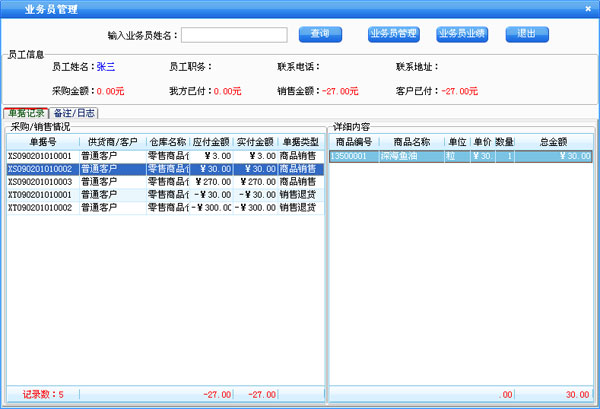 前台业务的单据默认保存的客户为'普通客户'、仓库为用户在仓库设置中设置的'POS 仓库'、经办人为空。这样的话可以看到前台的业务单与后台的业务单有一个明显的差别就是:前台业务单的经办人是空值,而后台的是不同的员工名称。