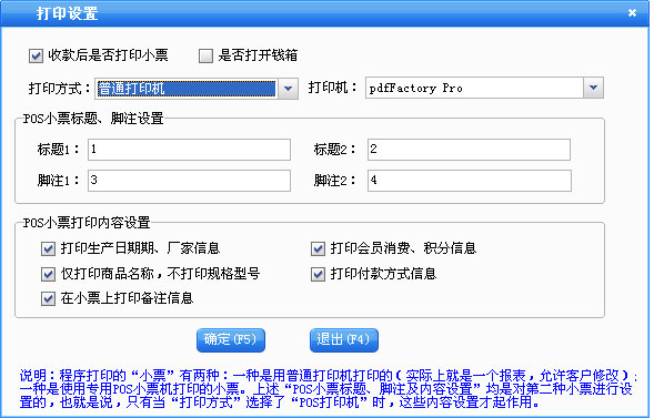 打印设置:设置小票的标题和脚注以及要选择的打印机。