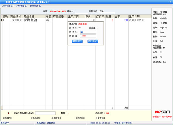 美萍食品业务管理系统提供了商品调价功能,并且在POS前台提供了商品兑换及会员优惠等功能。只要在后台的“系统设置”->“商品调价”窗口进行商品的调价设置后,在业务时,软件会根据不同的情况,自行根据设置,来选择不同的价格。