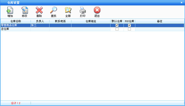 在基本设置模块中点击“仓库设置”按钮打开仓库设置窗口如图8。在窗口中可以看到所有的仓库。点击“增加”按钮打开增加仓库窗口,输入仓库的信息,仓库名称不能重复。如果选择中“默认仓库”在所有单据打开窗口的时候显示的为该仓库,默认仓库只能有一个。点击“修改”按钮可以修改选中的仓库信息。点击“删除”按钮可以删除选中的仓库,如果该仓库有业务发生则不能删除。点击“查找”按钮打开仓库查询窗口,输入相应的条件查询不同的仓库信息。点击“全部”按钮可以列出所有的仓库信息。