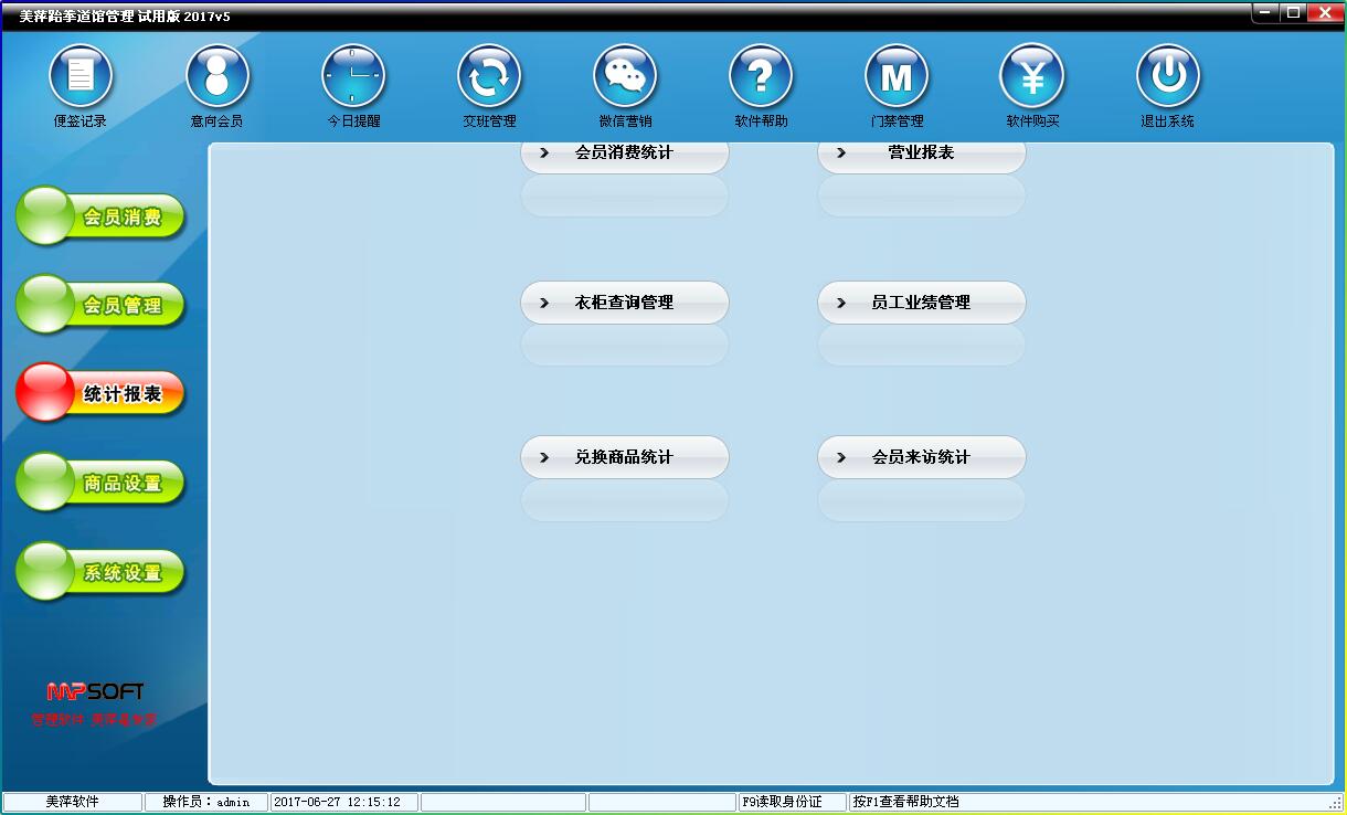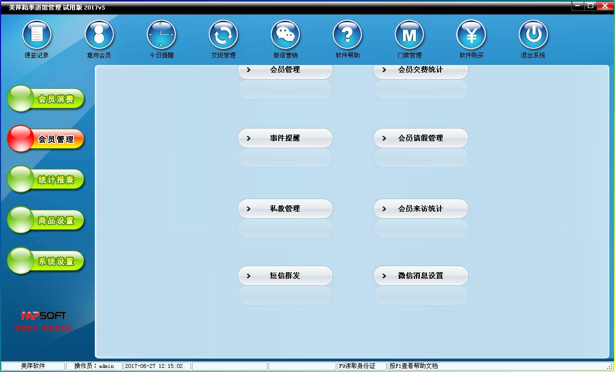 美萍跆拳道管理系统是一款专业的跆拳道俱乐部管理软件,系统界面简洁优美,操作直观简单,无需专门培训 即可上手操作,美萍跆拳道会所管理软件根据跆拳道俱乐部日常工作流程而特别设计,可以满足跆拳道会所经营过程的