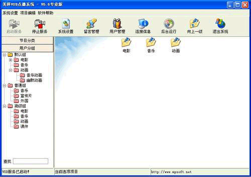 3)回到美萍VOD服务器,在各个节目类中添加您本地硬盘,网上邻居,或者Internet上的节目