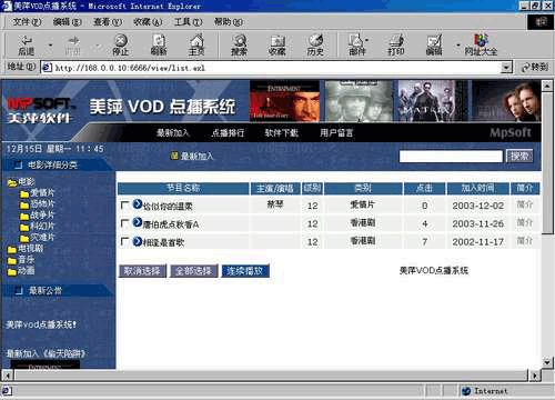 3、客户多界面支持:美萍VOD系统除了支持用IE浏览器进行WEB界面点播之外,还支持应用程