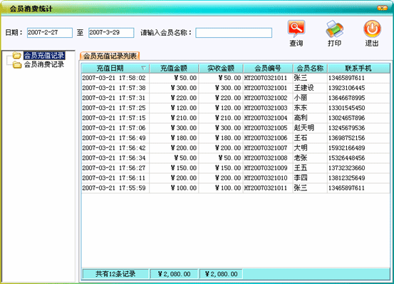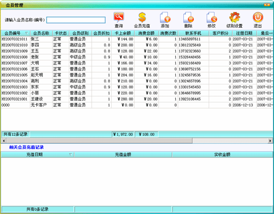 在会员管理窗口中(如图2.1.3.1),您需要先在“级别设置”窗口中(如图2.1.3.2)设置会员的级别和打折率,以便您在添加新会员(或是修改会员信息)时选择相应的会员级别。然后您在添加会员窗口中(如图2.1.3.4)填写新会员的相关信息。然后再点击保存按钮,进行会员信息的保存。然后您再到会员管理的窗口中,在会员记录的列表里选择您要充值的会员记录,再点击“会员充值”按钮,将弹出“会员卡充值”窗口(如图2.1.3.3),您可以在此窗口中为您选择的会员进行充值。 |