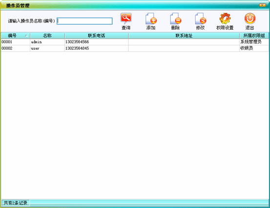 在操作员管理窗口(图2.1.4.1)中点击添加按钮,就会弹出添加操作员窗口(图2.1.4.3),在操作员信息这页里填写用户的相关信息,如果要设置权限只需在所属权限组这栏里选择用户所属的权限组即可。(注意:如果权限组还没有设置,您要点击“权限组设置”这页进行权限设置或到操作员管理窗口中点击权限设置。如图2.1.4.2)。如果您要修改(删除)操作员信息点击操作员管理窗口中的修改(删除)按钮即可。 |