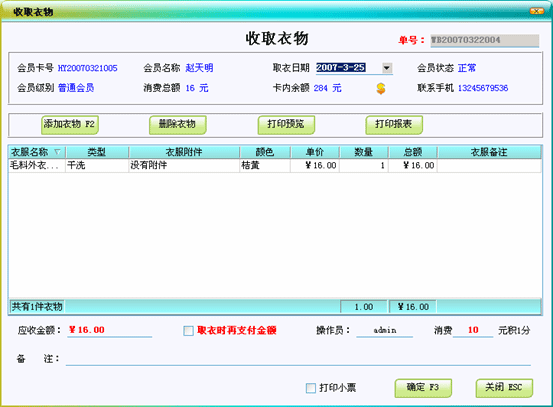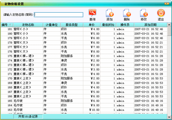 在衣物价格设置窗口(如图2.1.2.1)中点击“添加”按钮,就会弹出“添加衣物价格”窗口(如图2.1.2.2)。在“添加衣物价格”窗口中,您可以添加您所要给客户提供洗衣的名称,服务类型,与该服务类型相关的价格,更低折扣等信息。“添加”按钮是添加您所填写的衣物的某一服务类型,单价,更低折扣,先添加到窗口中的列表里,您可以将与该衣物相关的所有服务类型添加到列表里。“删除”按钮是删除列表里您不需要的数据记录。“保存”按钮是将列表里的数据记录保存到数据库里。到您添加洗衣记录的时候直接选择就可以了。 |