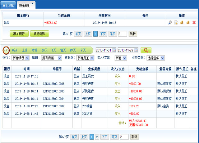 现金银行:此处记录了本系统中所有的财务支出、收入的汇总明细操作记录;