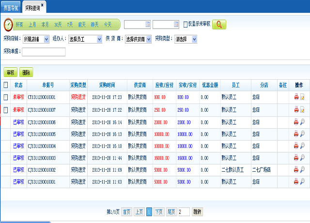 采购进货、采购退货都可以保存为待审核的单据信息,在采购查询中可以对待审核单据进行审核、查看、采购单据报表二次打印、删除、编辑(编辑页与添加采购单据页布局操作流程是相一致的);
