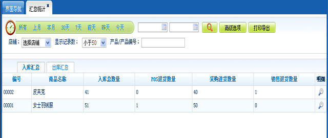 4.商品汇总:根据商品进行区分入库和出库的汇总统计。