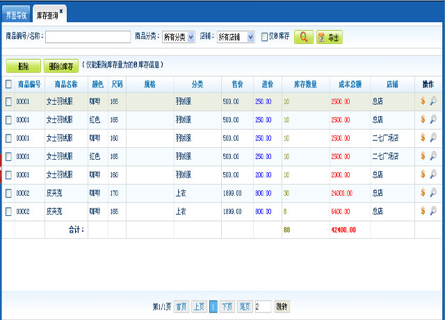 此模块主要显示商品的相信库存信息:服装管理中商品库存信息会根据商品颜色和尺码循环多个库存信息,各分店之间又会产生一条库存信息(只有通过采购进货的商品才会有一条库存信息记录);