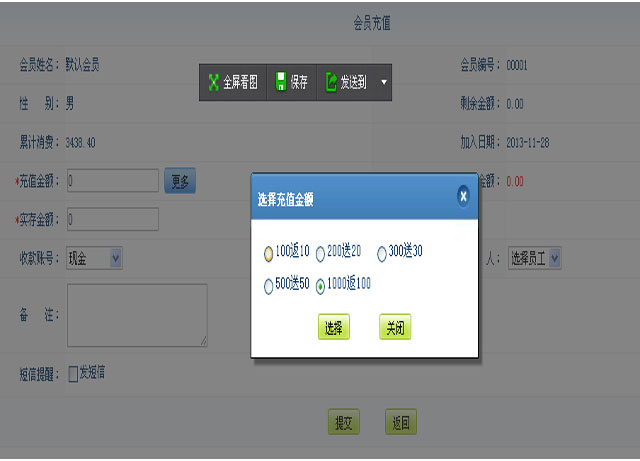 另本系统中有会员储值管理再此可以先设定好会员的储值规则,在会员续费操作中可以通过鼠标点击无需手动输入就可以对会员进行续费的操作;