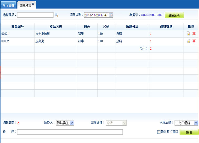 从一个店铺调拔一定数量的库存到另一店铺,提交后,需要在另一店铺的操作员登录后接收,调拔才算成功。
