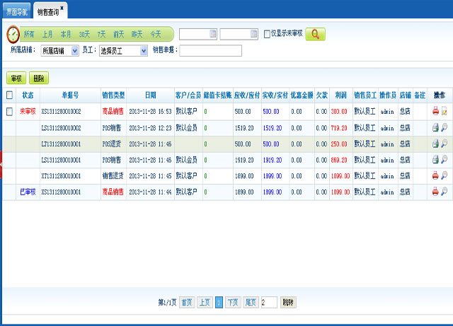 业务查询顾名思义此功能可以查询以往的商品业务、业务退货、POS业务、POS退货的单据信息;并可以针对商品业务待审核的单据信息审核或者删除修改商品业务待审核单据和单据小票补打或者但报表打印导出;