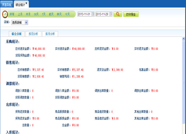 6.综合统计:将所有业务以及库存的数据整体的统计。