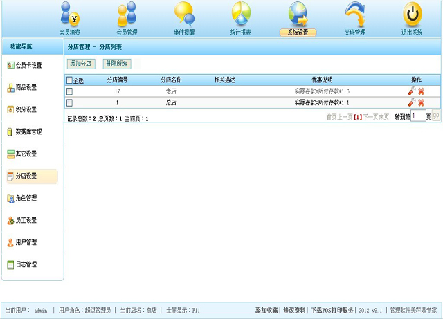 | 此模块用于设置您的各个分店,在此模块,您可以根据自己企业的实际情况 添加,修改,删除分店,一个分店对应一个总负责人,这会在后面的用户管理里得以体现,用户界面如图5.6所示; |