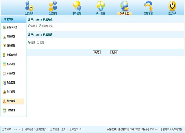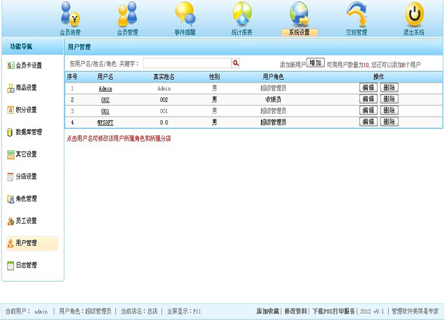 | 进入登录界面后,输入系统管理员分配给您的用户名和密码,登录系统。登录后,系统会根据您的角色以及您的权限,为您呈现不同的用户操作界面。例如您的用户角色是“分店一经理”(具体角色及权限的设置见下面具体步骤说明),那么您登录后,将只能看到分店一中的数据,报表部分也是针对分店一的报表;如果您的用户角色是“总店经理”,并且拥有总店经理的权限,那么您可以看到总店的会员,及所有分店的统计数据; |