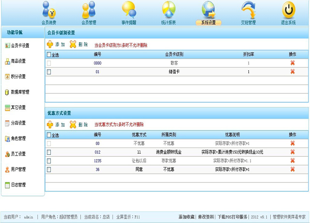 | 包括会员卡级别设置和会员卡优惠方式设置。 |