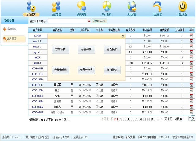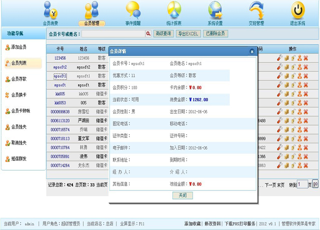| 此模块也支持快捷操作,直接在会员信息上双击可以对该会员进行快捷操作,操作界面同图1.4 |