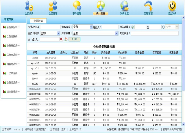| 此选项卡里根据会员的消费金额倒序排列,同样的可以根据条件得出您想要的报表结果; |