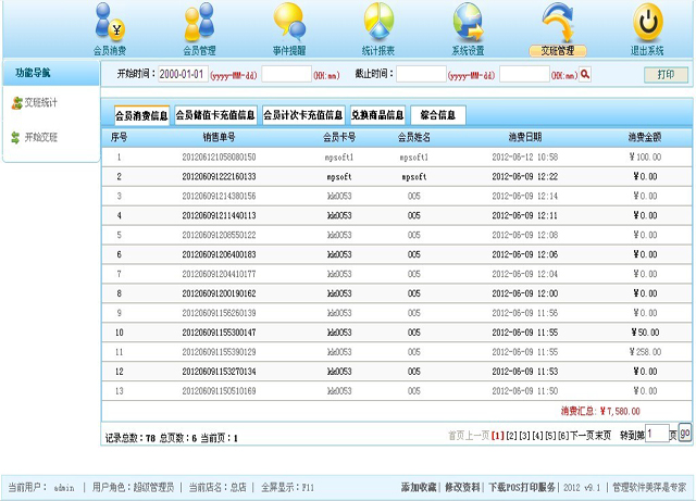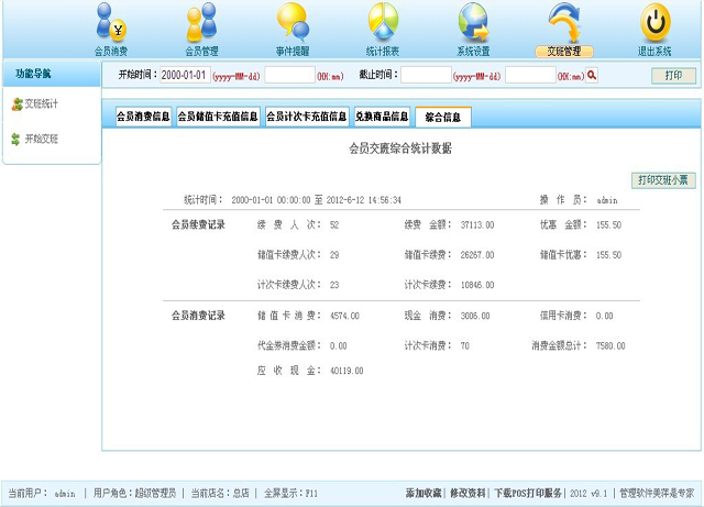 | 此功能用于营业员交班时,个人营业数据的一个统计,包括会员消费情况,会员充值情况,兑换商品情况,还有一个综合统计数据,几乎包括了您关心的该营业员值班期间的所有的操作数据信息,基本的操作界面如图6.1,6.2所示。 |