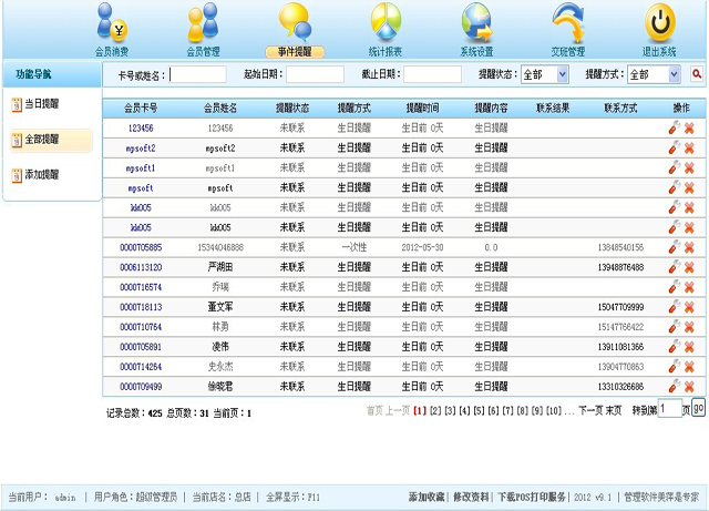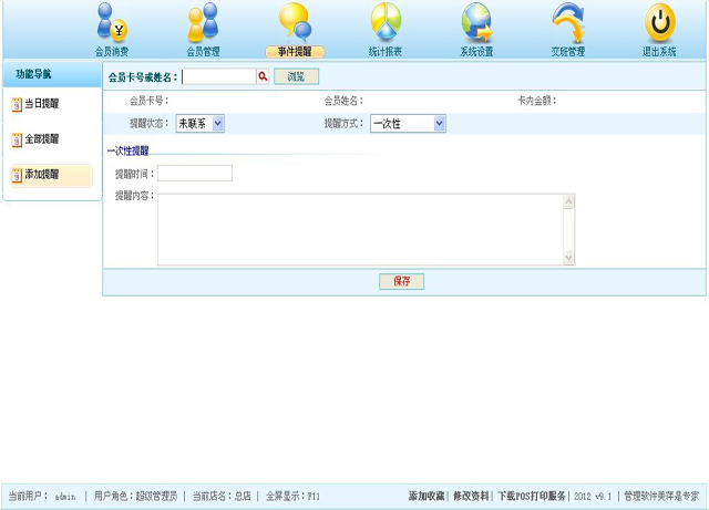 | 此模块中显示的是系统中对应分店的所有的提醒; |