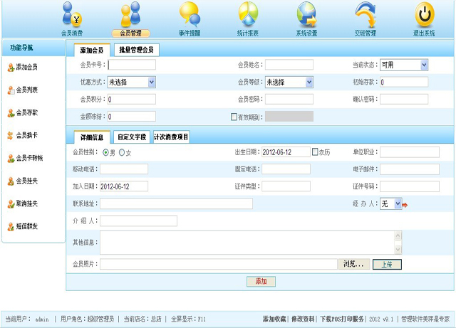 | 功能如题,需要说明的是,添加会员的同时,可以直接为会员添加计次消费项目,上部的信息请仔细填写,下部的信息为选填信息,如果要添加计次消费项目,选择“计次消费项目”标签,增加计次消费项目,更后点击“添加”按钮完成会员的添加,操作界面见(图2.1 添加会员) |