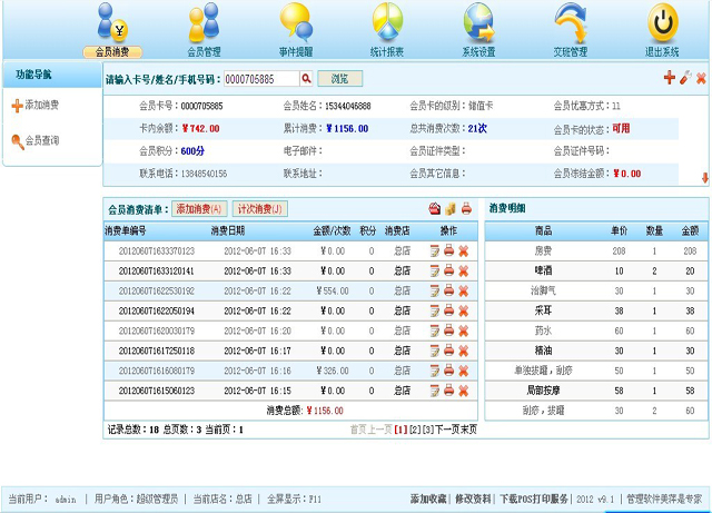 | 1.会员消费 操作步骤:选择会员 添加消费 收费确定; |