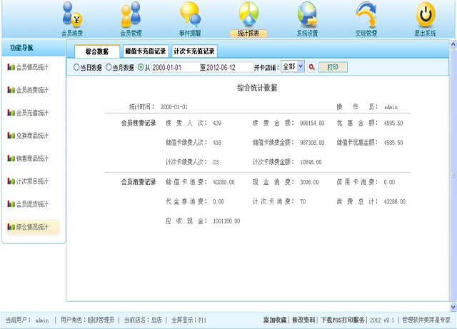 | (2)查看综合数据信息,包括会员续费相关的统计信息(续费人数,续费总金额,优惠总金额)和消费相关的统计(储值卡消费多少钱,现金消费多少钱,计次卡消费多少钱,总共消费多少钱等),具体信息见图4.7 |
