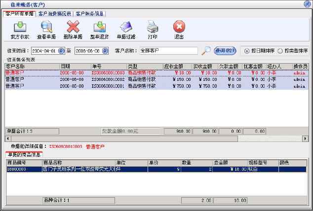 对客户付款可以分为三种:第一种是在商品业务的窗口中,“应付金额”是该单据中所有商品金额的累加意思是客户共需要支付多少金额,在“实付金额”后可以输入实际客户支付的金额。第二种是在业务管理中点击“往来帐务”按钮,在出现的窗口中选择要收款的客户,这时会列出在某段时间内与该客户有关的业务单、退货单、付款单。然后选择要收款的业务单,点击“收款”按钮,在出现的窗口中选中对某个单据付款,这样会修改该业务单的实付金额。第三种是在“往来帐务”窗口中点击“收款”按钮,在出现的窗口中选择“新增收款单”即可增加一条新的收款单。