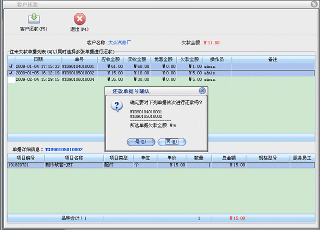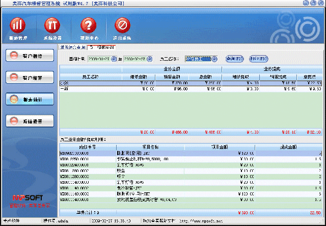 注意:汽车维修管理系统是与汽车配件管理系统相结合使用一套软件,汽车维修管理系统主要是针对客户选择的配件维修服务项目进行结算汇总,对员工的业务服务提成进行汇总,其中维修所需的配件、客户信息是在汽车配件管理系统中进行管理。