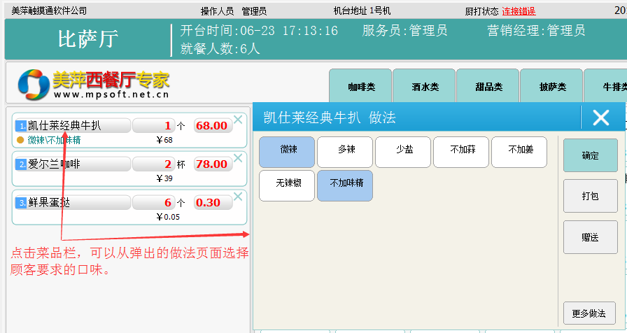 | 1.菜品沽清:分为临时沽清(隔天自动转为正常状态)和餐段长期沽清(如胡辣汤只在早餐供应,则每天超过早餐时段,胡辣汤自动进入沽清状态)。 |
